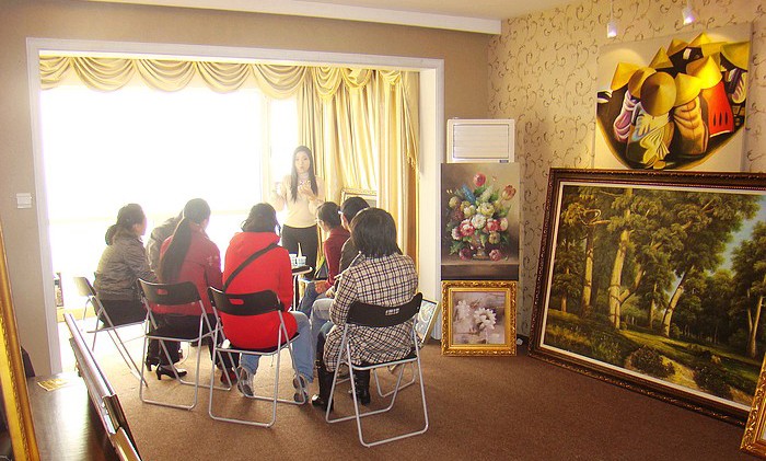 2. 既然是课堂,当然会有教具啦,一幅色彩艳丽而协调的丁绍光风格油画,就在讲师的手上,作为分析案例的道具。座位上的业主们各个听得聚精会神。